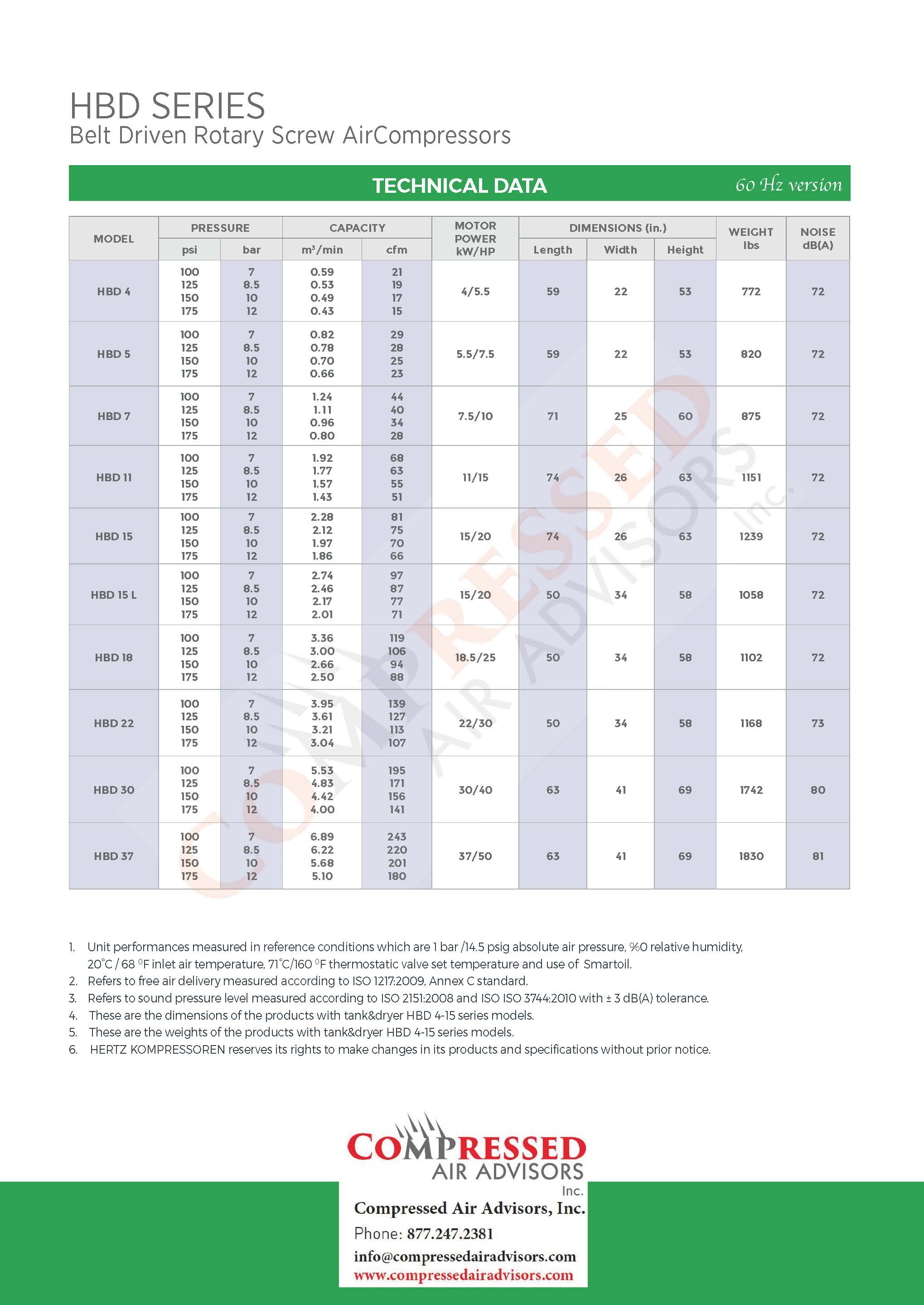 Hertz Kompressoren HBD 11 - 15hp Rotary Screw Air Compressor, Base Mount 63 CFM @ 125 PSI, 10 Year Warranty Available