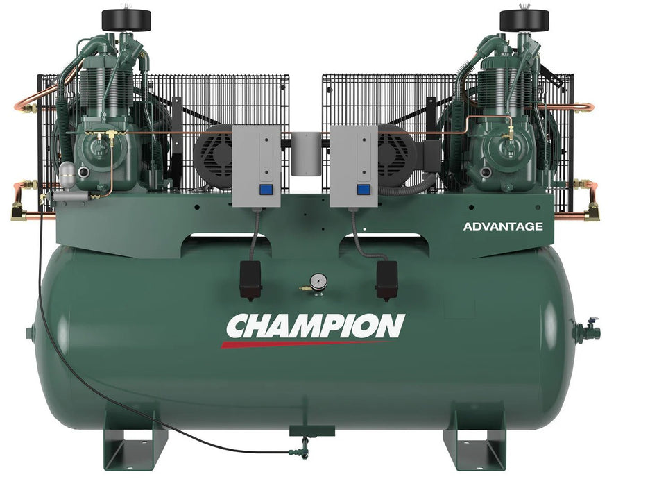 The Champion HR10D-24 Advantage Series provides serious air power and built-in redundancy for continuous-duty industrial applications. Equipped with two 10 HP, two-stage compressor pumps, this duplex system produces a combined 67.6 CFM @ 175 PSI, delivering consistent, high-volume air for manufacturing facilities, body shops, and production operations that can’t afford downtime.